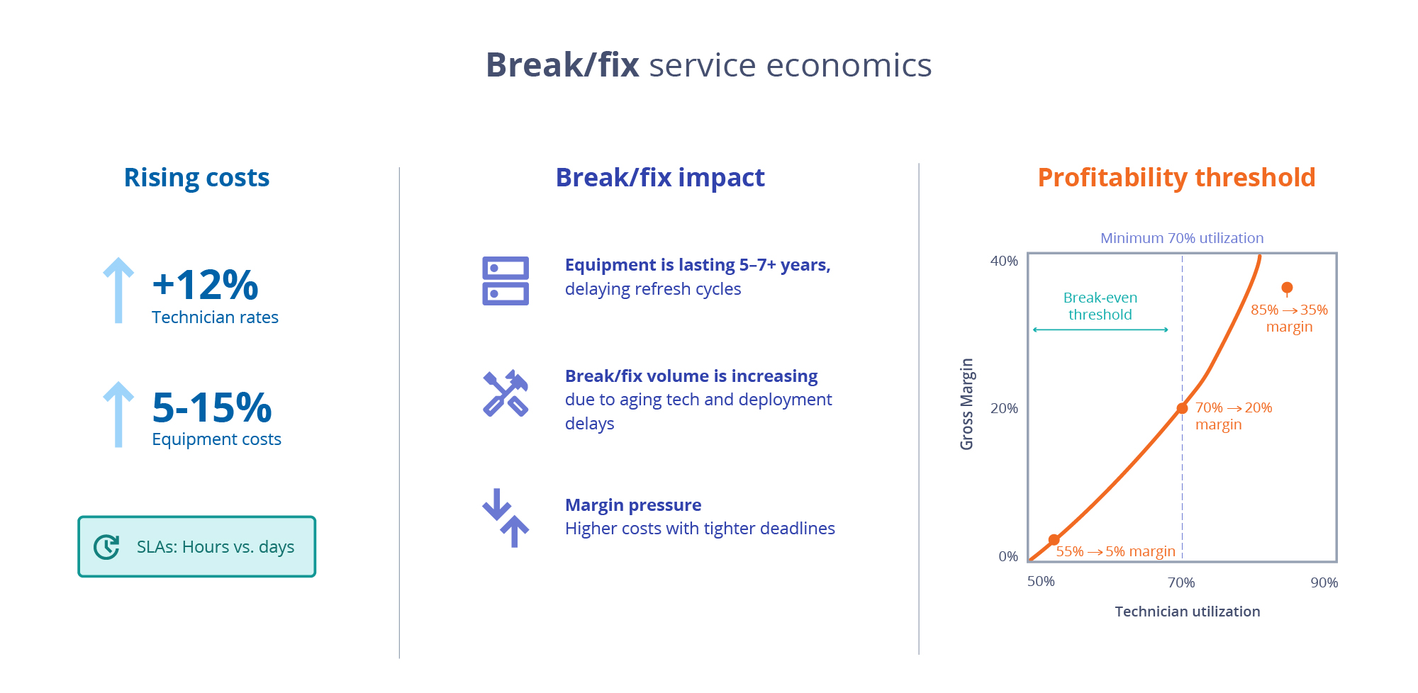 Our analysis shows that profitability suffers significantly when technician utilization falls below 75%. This is where on-demand break/fix work provides a valuable solution. It can fill gaps in technician schedules and maintain higher utilization rates to preserve margins.