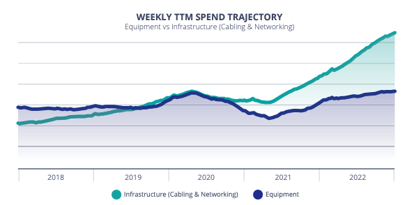 While it took a dramatic hit, infrastructure work recovered more strongly and actually accelerated. Over the past year and a half, infrastructure work has grown 100%. The graph below (which represents the 12-month-trailing spend to give a better sense of the general trajectory) illustrates this trend clearly: