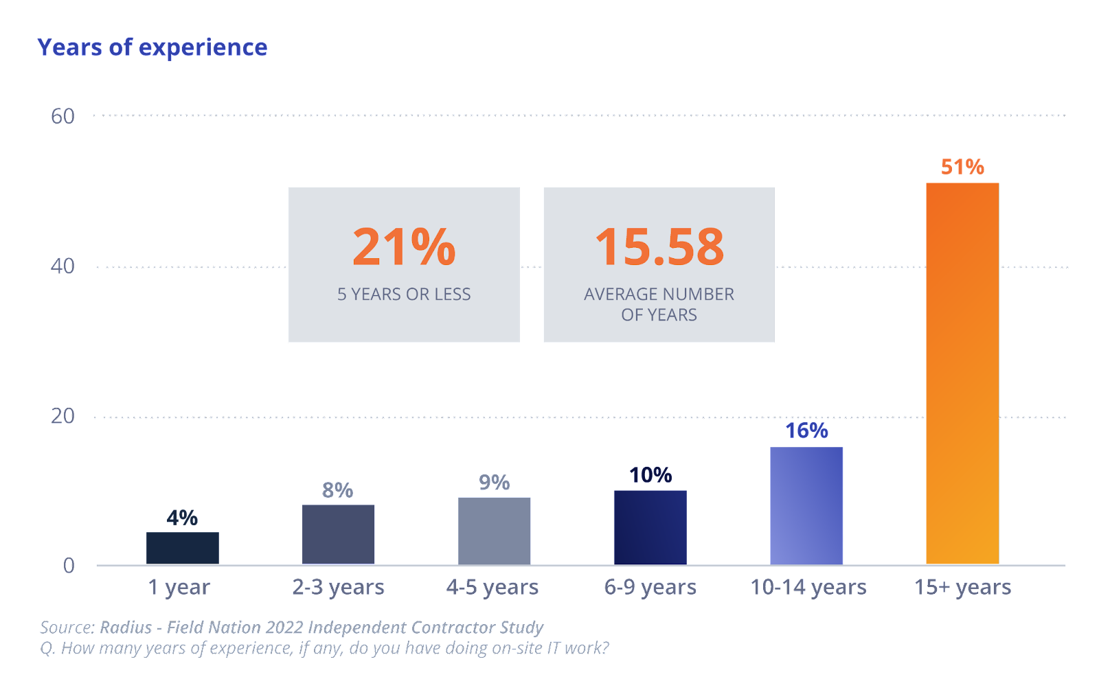 According to the Radius-Field Nation 2022 Independent Contractor study, the workforce choosing IT field services contract work is highly experienced, with two-thirds (67%) having a decade or more of experience, and nearly half having a decade or more of independent contracting experience.