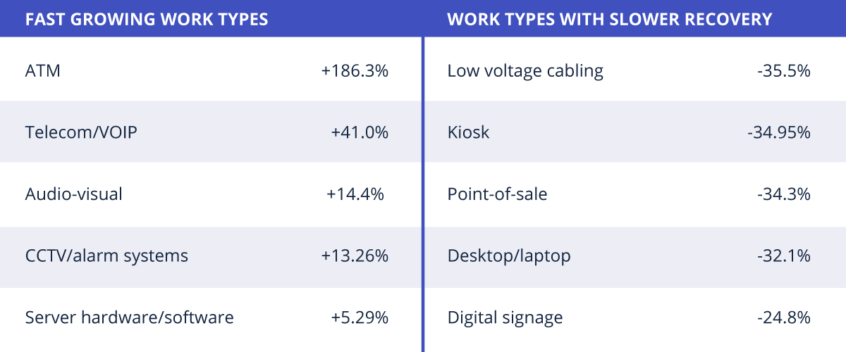 We are seeing an increased demand across certain work types, such as ATM and telecom projects. But some other work types like low-voltage cabling and kiosks have been slower to recover.