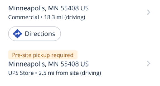 When ‘Shipping to other location’ is selected and an address is provided, providers in the mobile app and on the web will see a ‘Pre-site pickup required’ chip along with the pickup city, zip code, and the location’s distance from site. When the work order is assigned, providers will see the same chip plus the full work order address and the full pickup location address.