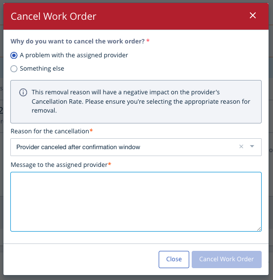 To better support buyers in choosing the most accurate removal reason, we’ve made changes to the assignment removal and work order cancellation workflow to give buyers visibility into which reasons negatively impact the provider’s Cancellation Rate. Moving forward, if a buyer selects a cancellation or unassign reason that negatively impacts the provider’s Cancellation Rate, they’ll see this alert on the page before confirming the action.