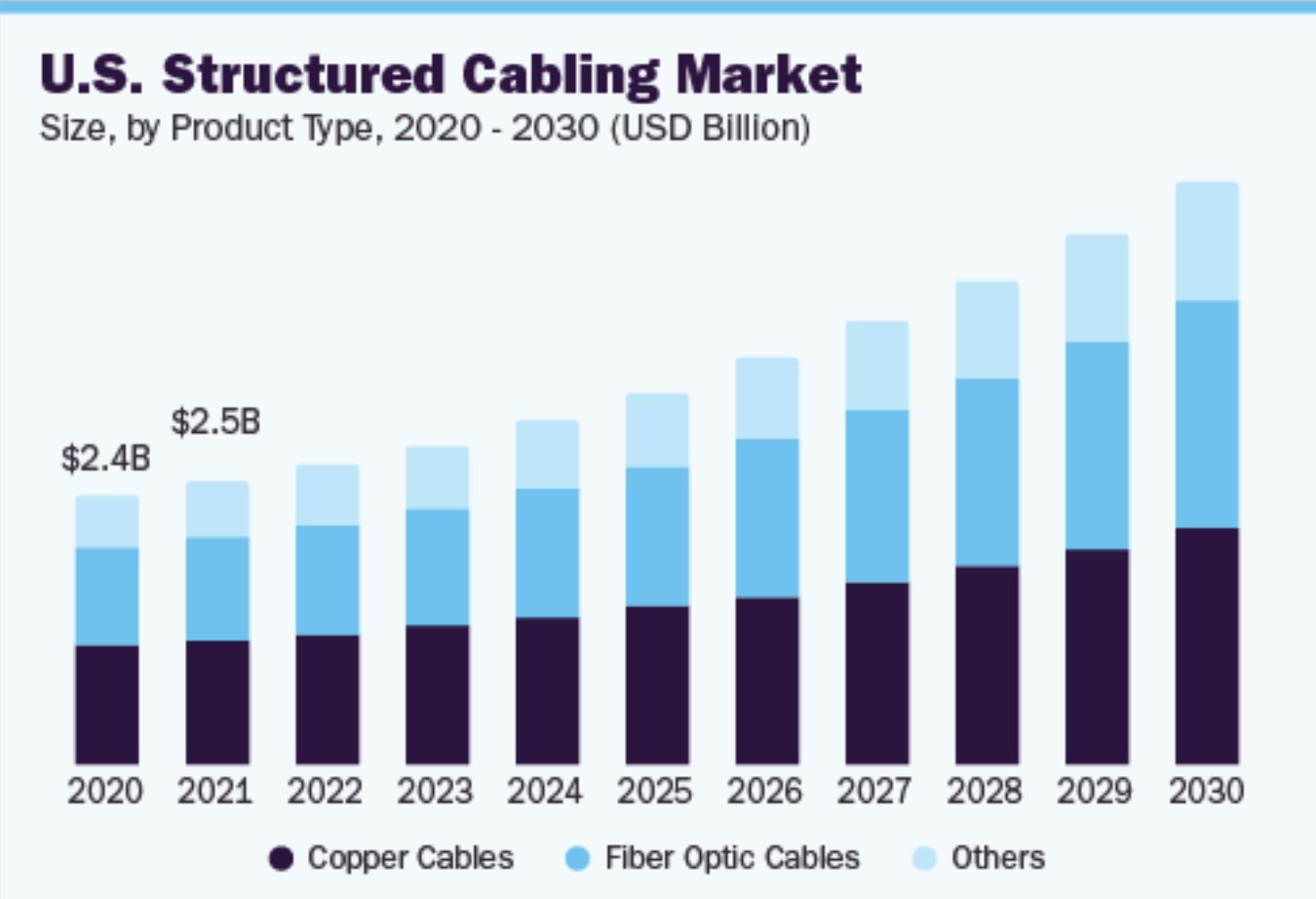 The continued requirement for connectivity has driven significant growth in both fiber optic and copper infrastructure. According to Grand View Research, copper dominated the market with 49.8 percent market share, while fiber has the highest annual growth rate.