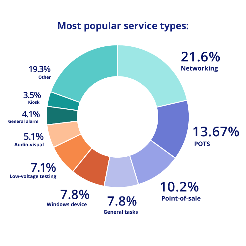 The Field Nation marketplace saw a diverse range of service types in 2024. Networking, POTS, and Point-of-Sale emerged as the most in-demand categories, reflecting the critical needs of companies and the expertise of technicians using the platform.